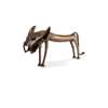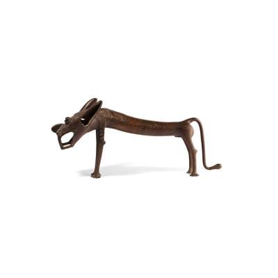 cast bronze, shown standing, with open maw, upturned ears and coffee-bean eyes, with fine detailing to the mane, long torso and curling tail