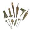 cast and worked bronze, the collection consists of a range of weaponry, hair pins and utilitarian objects; one Western European early Bronze Age flat axe, one Near Eastern middle Bronze Age spearhead with curled tang, one Luristan late Bronze Age axehead, one Near Eastern Bronze Age arrowhead, two Near Eastern Bronze Age dagger blades, one with integral tang, the other with perforations and seperate rivets, a pair of European Bronze Age hairpins, one with a spiral head the other with a cup design and two Roman doctors tools (12)