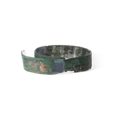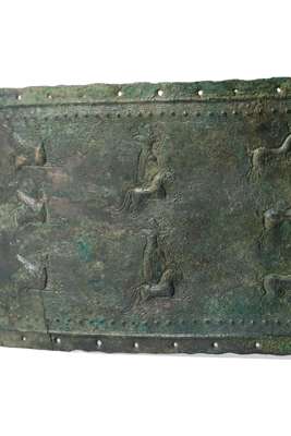 engraved bronze, of typical form, with incisions along the border for attachment to a leather backing, decorated with images from mythical scenes; goats, lions and otherworldly creatures are hunted by archers, the panels are separated by images of flowers, palm and date trees, mounted on a plexiglass backing, with an Axel Guttmann collection label reading "AG. R 248"