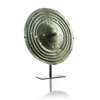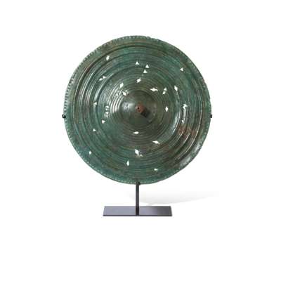 hammered sheet bronze, of circular form with an outer border of small raised dots, moving inwards a series of concentric ridges to a central dome and large bronze rivet projecting from the centre, pierced with multiple perforations, raised on a bespoke mount