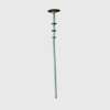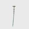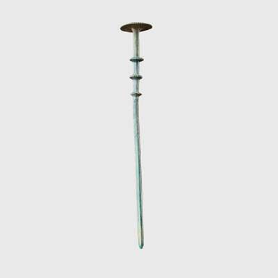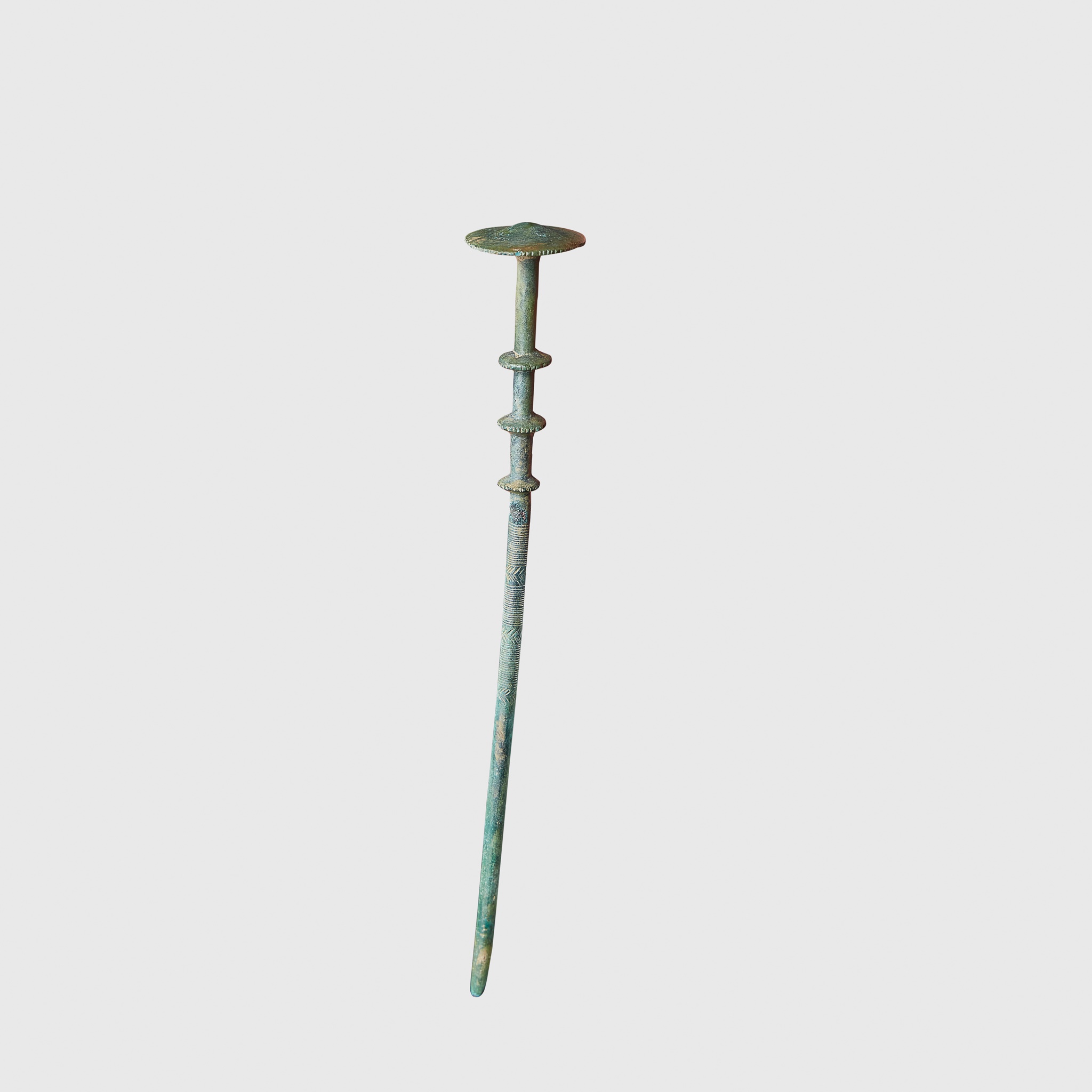 cast copper alloy, a rounded shaft with three ridges leading to a circular finial