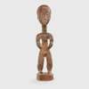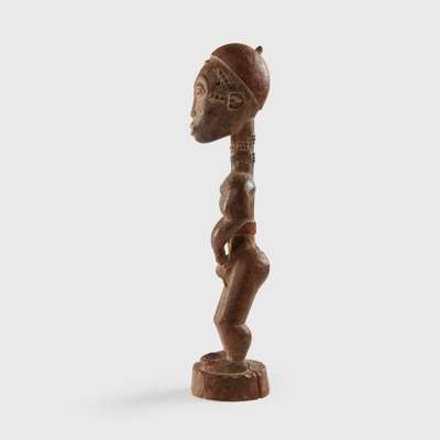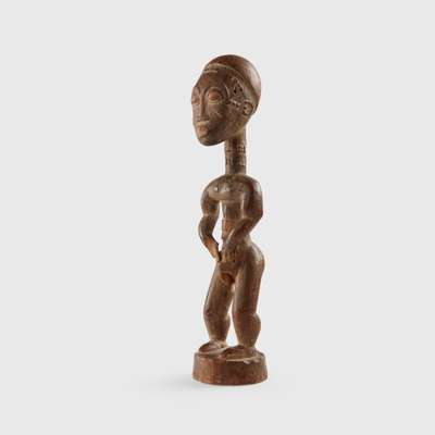 carved wood, standing on an integral plinth, the broad legs and buttocks rising to a slender waist, the powerful arms meeting at the midriff, with a distinctive long neck, serene face with arched brows and prominent scarification, wearing a skull cap