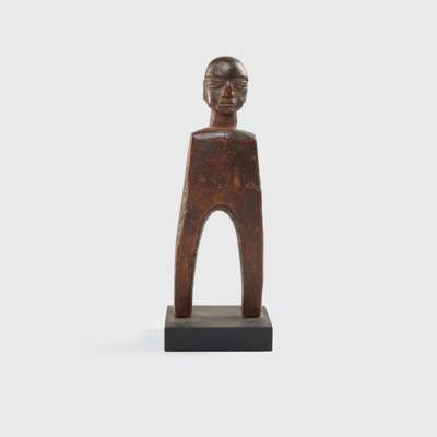 carved wood, of anthropomorphic form, the attachment frame forming the legs, rising to a neck and human head finial, raised on a bespoke mount