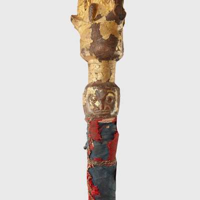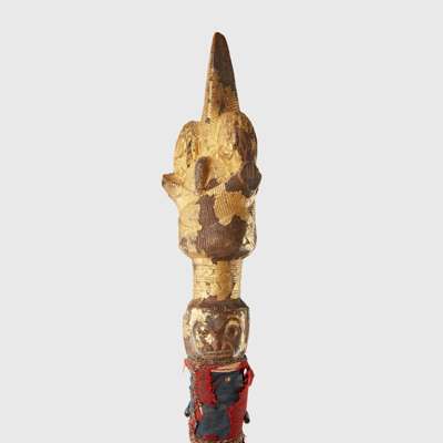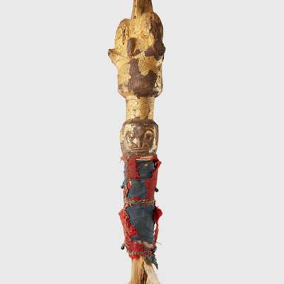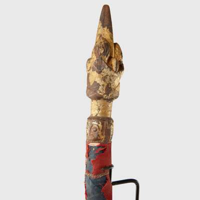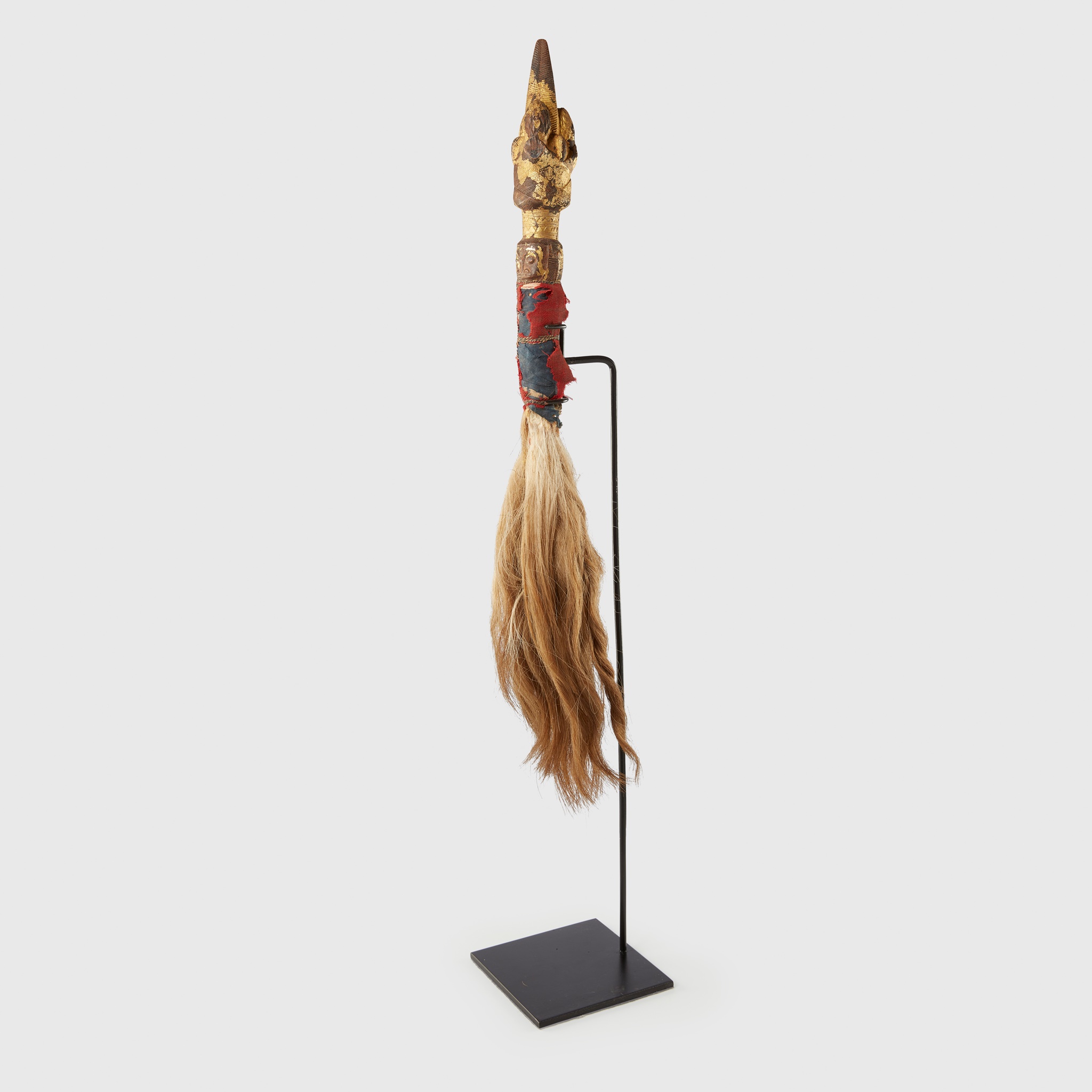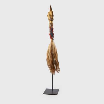 carved wood, gold leaf, textile and hair, the handle wrapped in blue and red stitched fabric with carved wood human face finial above covered in gold leaf, animal hair whisk below, raised on a bespoke mount