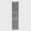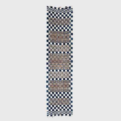 Interlaced pigmented fibres over cane strips, expressed in geometric forms, executed in indigo and mauve dye
