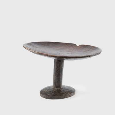 carved wood, standing on a flat circular base, stem support and wide seat with incised triangles running along the border, rich patination