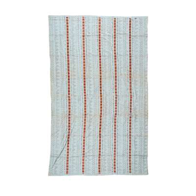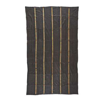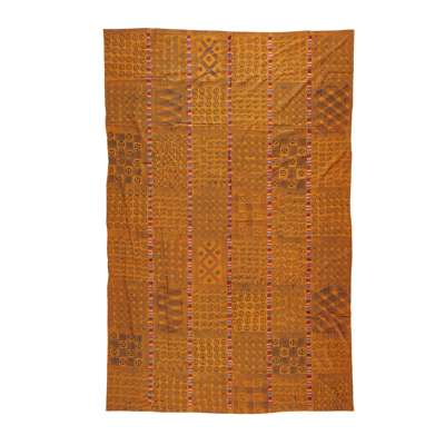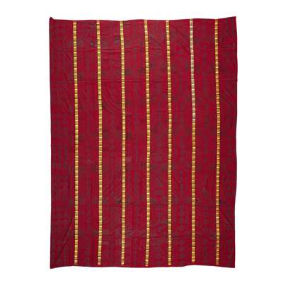 strip cloth, the first with a series of separate panels, each block printed with geometrical designs on a yellow ground, the strips sewn together with multicoloured thread; the second block printed on a black cotton ground, the strips sewn together with multicoloured thread; the third block printed on a white cotton ground, the strips sewn together with multicoloured thread; the fourth block printed on a maroon cotton ground, the strips sewn together with multicoloured thread (4)