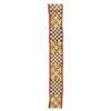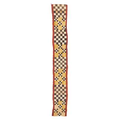 raffia and textile, a red fabric border frames a white and navy patchwork with additional overlaid yellow dyed elements