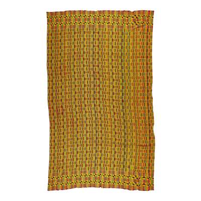 strip woven cotton, formed of twenty-two strips, a bold design with a regular series of weft faced bands containing a zig-zag motif of yellow, black and green thread