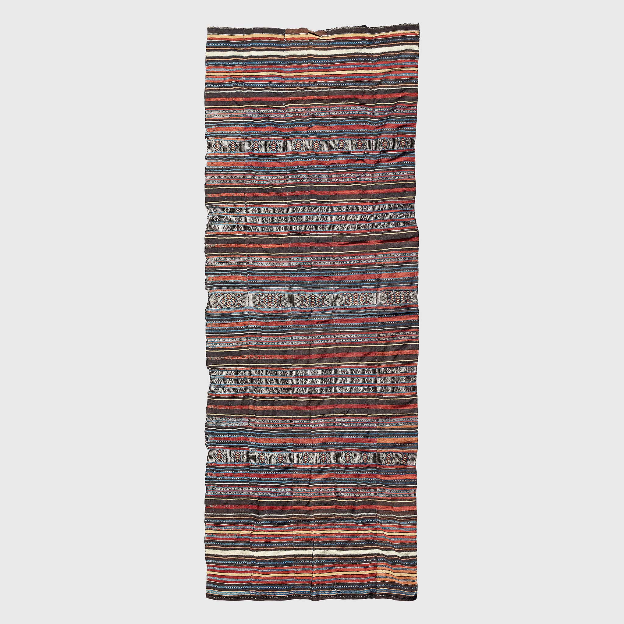 The Arkilla Kunta is a luxury item among the semi-nomadic peoples of the Sahel. Produced by male Fulani weavers using a double-heddle backstrap loom, with designs partly based on North African (Berber) traditions. Usually woven on commission only and intended for use as a tent-divider or marriage-bed curtain.