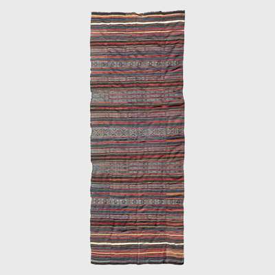 woollen weave, dyed using vegetal and mineral pigments, strip cloth with intricate designs in red, yellow, blue, black and natural colour, 5 strips are subdivided into horizontal bands, some solid and some featuring floating motifs