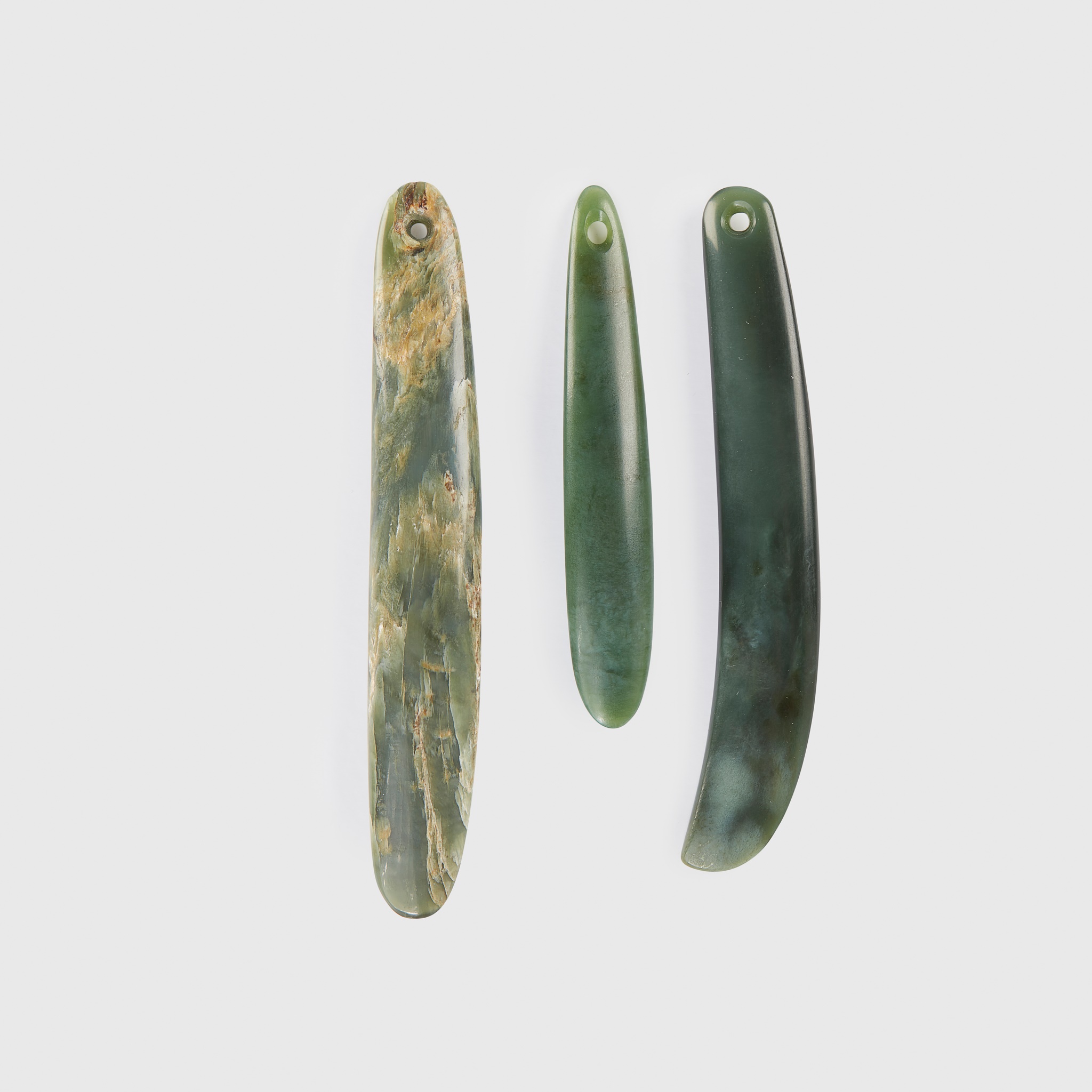 carved and polished jade, two of elongated oval form, with perforation to the top; the third with a similar perforation to the top, with a subtle curve at the base (3)