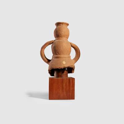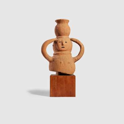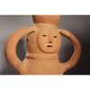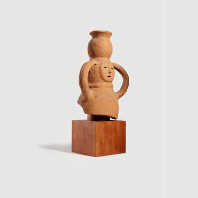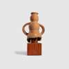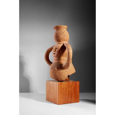formed of low fired red earthenware, depicting a young lady holding a water jug atop her head, she wears a necklace, with triangular nose and oval perforations for the eyes and mouth, raised on a bespoke wooden mount