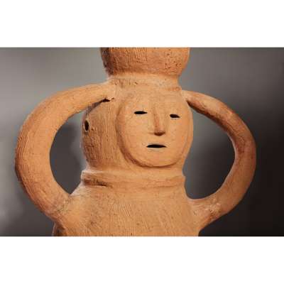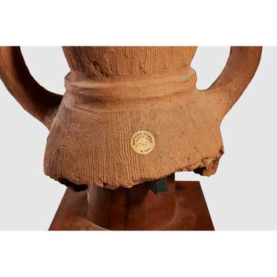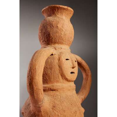 The present example was uncovered near Haniu village, Gunma Prefecture, a leading regional centre for the production of haniwa. Stylistically a similar example can be found at The British Museum (accession number Franks.2210). Yet the depiction, that of a girl holding a water jug atop her head, is an unusual one, with the vast majority of female forms depicting miko. She is also missing the flat shelf-like headdress most often associated with the ritual specialists, once again pointing to the more prosaic yet rare attribution of a worker or servant.