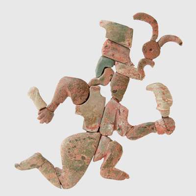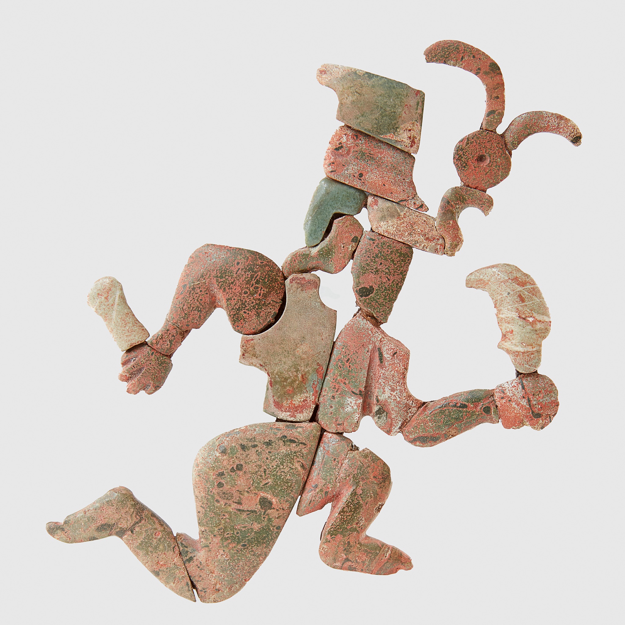 jadeite, formed from twenty-one pieces of individually carved and polished pieces, embellished with ground cinnabar, depicting a shaman in motion, elaborate avian headdress, carrying a knife in his left hand and another tool in the right, presented on a bespoke mount
