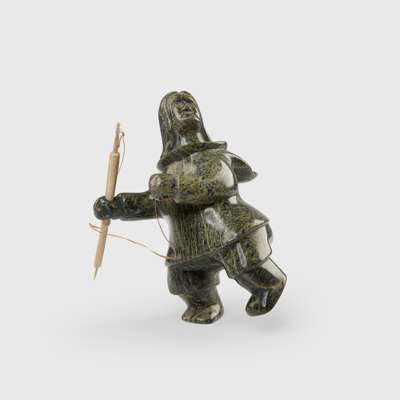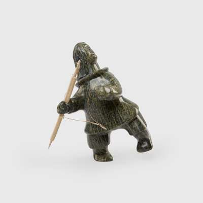 carved green steatite, caribou antler and seal gut, the hunter is shown with their weight on the back leg, preparing to throw a harpoon