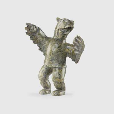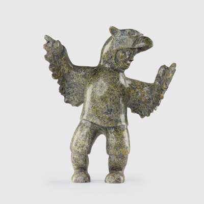 carved steatite, the standing shaman wearing a raven headdress and with the arms outstretched