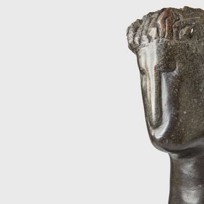 The present example, carved in springstone (a form of black serpentine) likely depicts a village girl. The influence of Modigliani might be detected in the elongated face and stylised features. Though Modigliani himself was of course shaped by African art in turn, particularly by the streamlined, pursed lips of the Guro masks of the Ivory Coast.