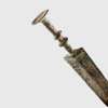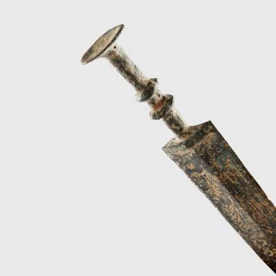 cast bronze, slender blade with pronounced central ridge, dual ridges to the handle and a circular pommel