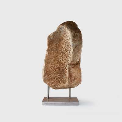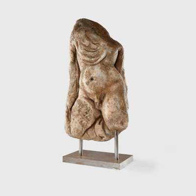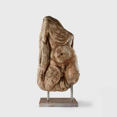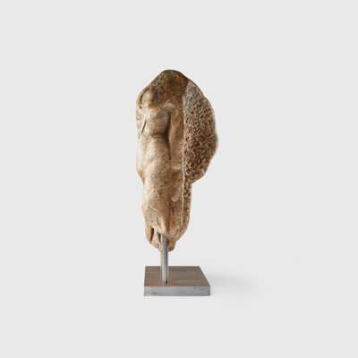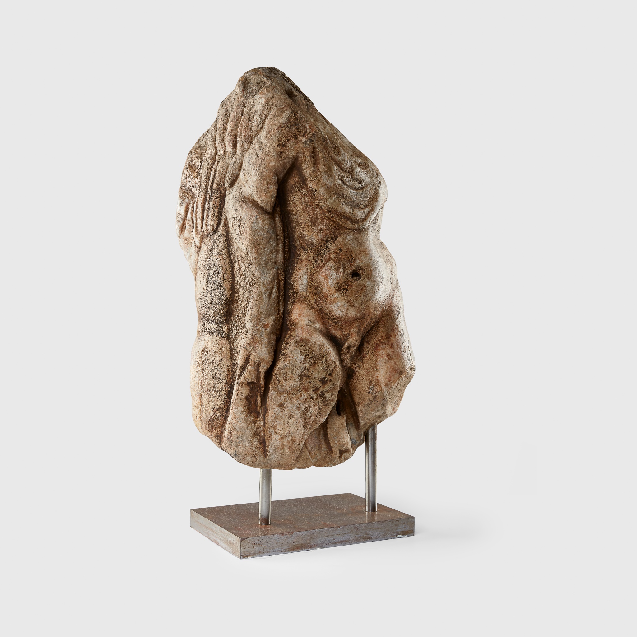 carved stone, a corner fragment from a large sarcophagus, Hercules is shown with his weight balanced upon his left leg, the torso subtly turned, powerfully built, he is shown nude, with the exception of the Nemean lion-skin cape tied at the chest with the mane flowing behind, raised on a bespoke mount