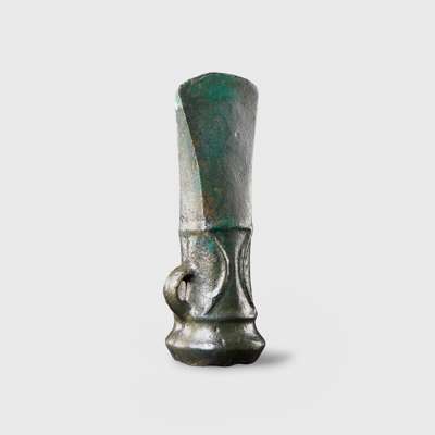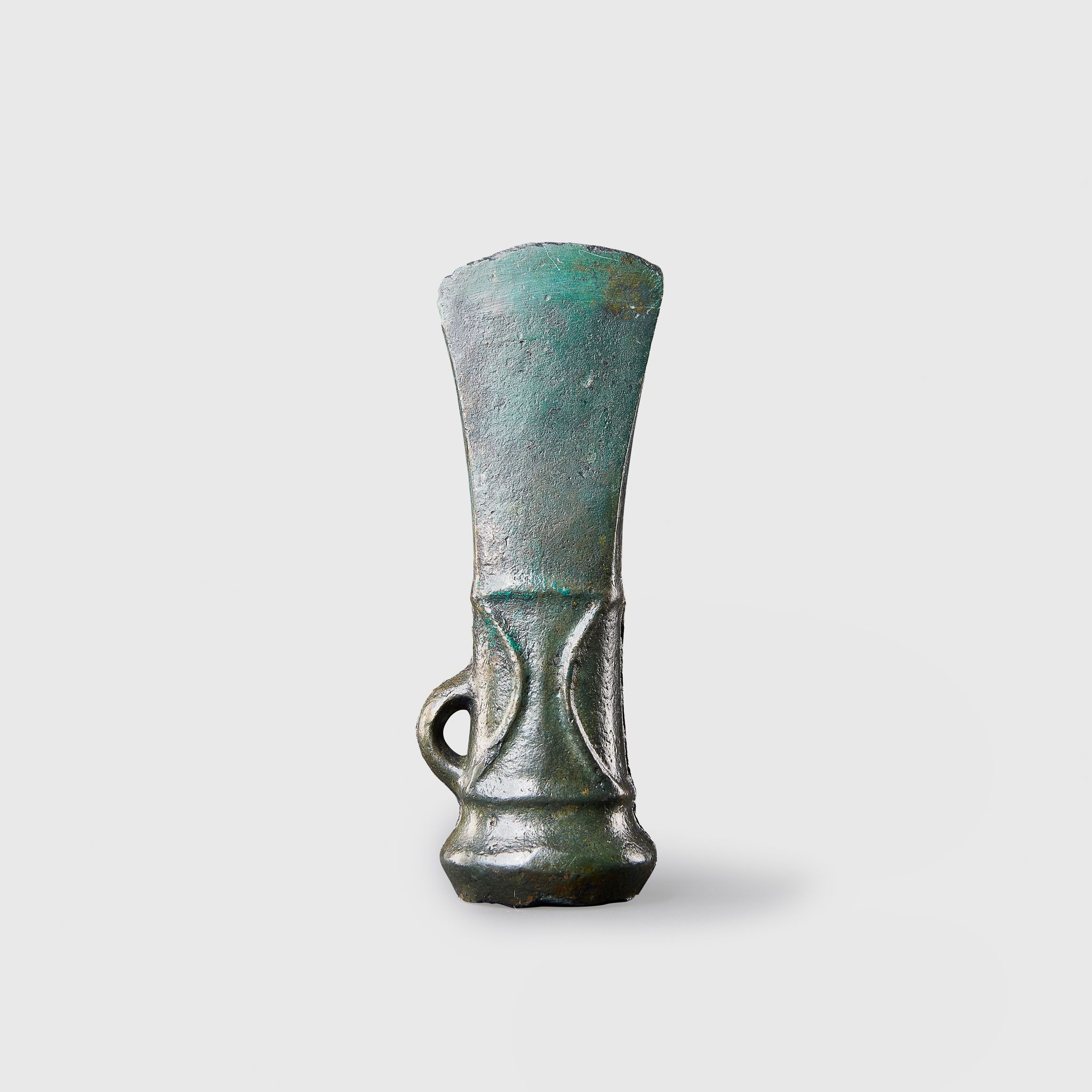 cast bronze alloy, of the Sompting type, ribbed collar below raised double crescent decoration, looped handle and flaring blade
