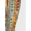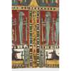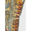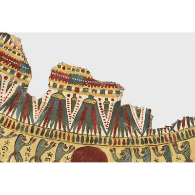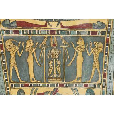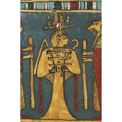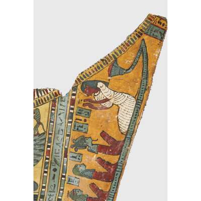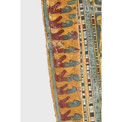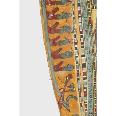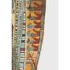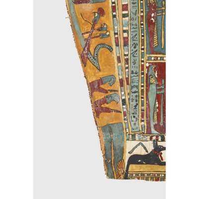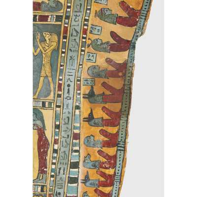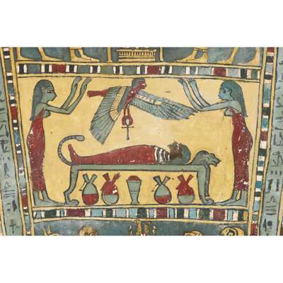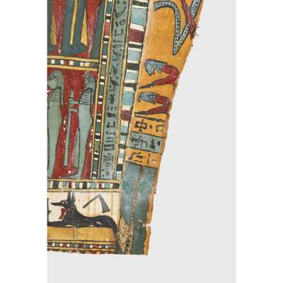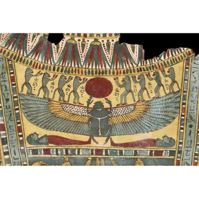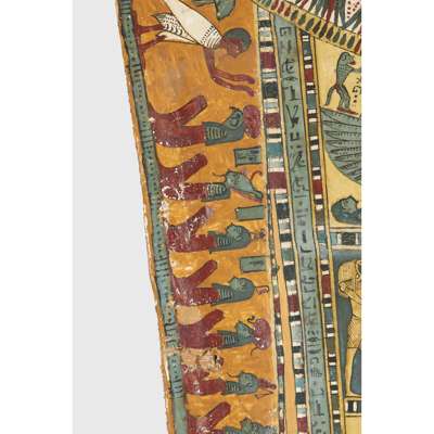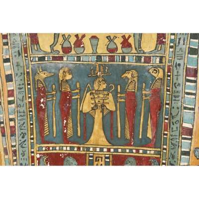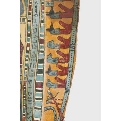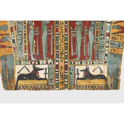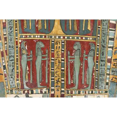 pigment over cartonnage, the top of the central register depicting a winged scarab holding a sun disc, two mummified figures, likely the deceased, lie underneath, the register below features four gods; Isis, Nepthys, Thoth and Horus, flanking a crowned sceptre and two Pschent-crowned uraei representing Lower and Upper Egypt, two human headed birds are also seen, standing astride two sceptres, the third register depicts the deceased in mummified form, lying on a lion headed brier whilst Ba flies above, beneath we see the four canopic jars of the mummification process, the fourth register depicts the four sons of Horus, gods of the mummification process; the jackal-headed Duamutef, baboon Hapi, falcon-headed Qebehsenuef and the human appearing Imsety, the deceased is presented between them, their legs and ribs forming into a djed pillar, the fifth register shows four further dieties, coloured green to associate them with the underworld, the final panels at the base depict dual Anubis figures in jackal form, split by a vertical band of hieroglyphs, the central registers are bordered by two similar scenes depicting a funeral barge with each vessel carrying different deities, lead by Isis on the right and Ba on the left