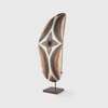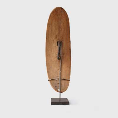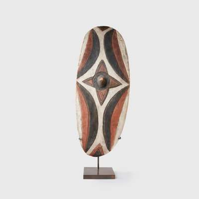 carved wood and pigment, of elliptical form, with a bold geometric design executed in hues of red, black and white, with integral handle and presented on a bespoke mount