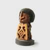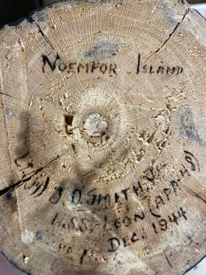 carved wood, the squatting figure shown with large bulbous head, holding a shield-like openwork plaque, the inscription on the base reads: "NOEMFOR ISLAND ... Lt. J.D. SMITH ... USS LEON (APA - 48) ... DEC 1944"