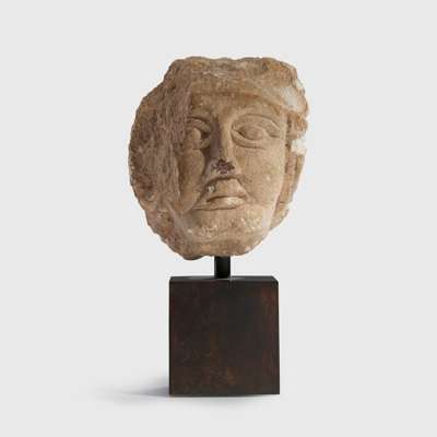 carved stone, shown with strong jaw and full lips, the long hair framing the face, traces of red pigment to the nose, raised on a bespoke mount
