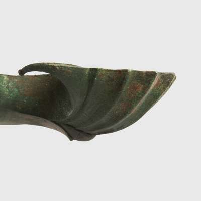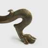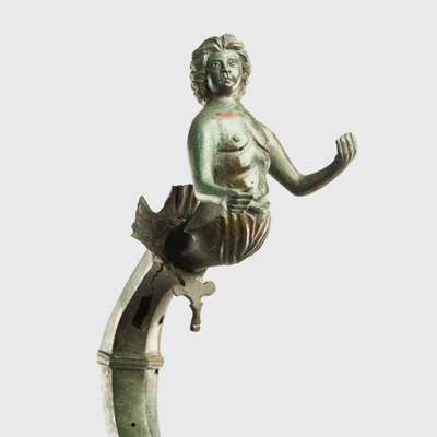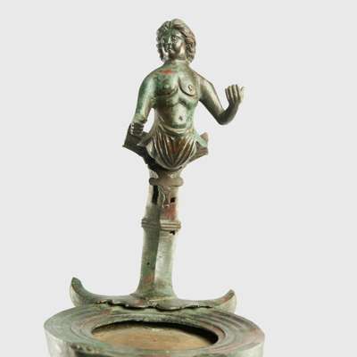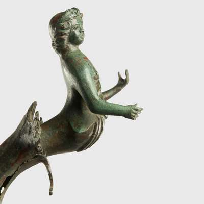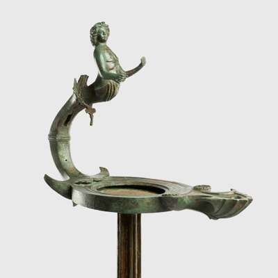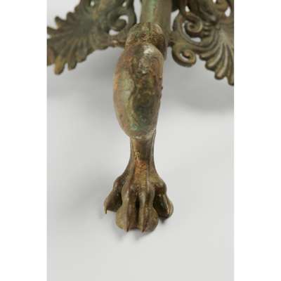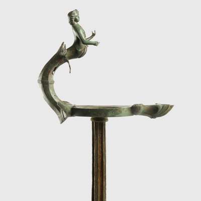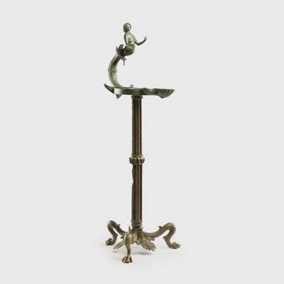 cast bronze, standing on three supports modelled in the form of griffins’ legs, the sinuous clawed feet displaying fine detail, the long stem ribbed and leading to a stand with a superbly modelled youthful figure of a god, possibly Triton, shown bare chested, with powerful physique and flowing hair swept back into the nape of the neck, the opposite end of the stand with scalloped finial