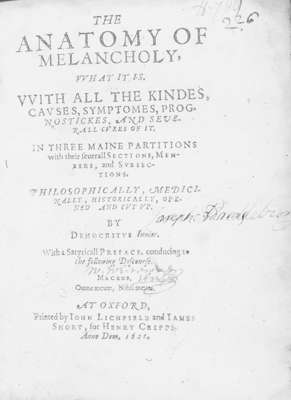 THE ANATOMY OF MELANCHOLY; WHAT IT IS, WITH ALL THE KINDES, CAUSES, SYMTOMES, PROGNOSTICKS AND SEVERALL CURES OF IT