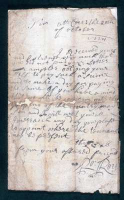 to Bailie Alexander Buchanan of Dullater, expressing surprise that recipient is delaying the payment of some unspecified sum; 'if yow have a mind that we will be concerne[d] with the Keeping of the country yow may sen[d] and I will meet yow at Imerraich any day yow please to appoint where the tennan[t]s may be present'; together with a later envelope inscribed 'Rob Roy's l[et]tre to Baillie Buchanan' (2). The letter is signed 'Ro: Roy', an exceptionally rare form for him to use as virtually all Rob Roy's known letters and contracts bear his formal signature 'Ro: Campbell'.