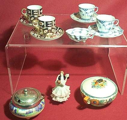 six cans and six saucers, a Royal Copenhagen coffee set 1037, eight cups, eight saucers, tray and sucrier and a Continental figure group, a lot