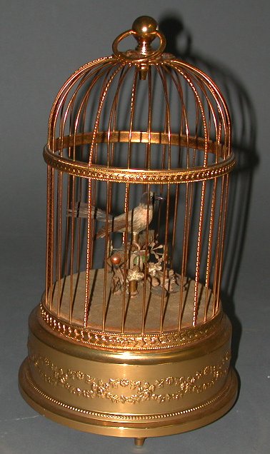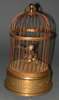 in the form of a gilded cage containing a feathered bird automaton above a base containing the movement