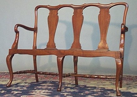 of George II design, the yoked toprail with three solid vase shaped splats, the scroll arms above upholstered drop in seat, on cabriole legs with pad feet, joined by turned stretchers, with trade label for A. Overfield & Co, Leeks, Staffs