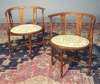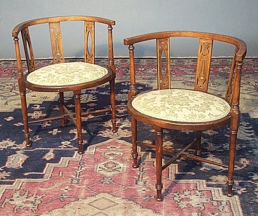 the curved top rail above three pierced inlaid splats, the stuff over seat on turned legs and X stretcher (2)