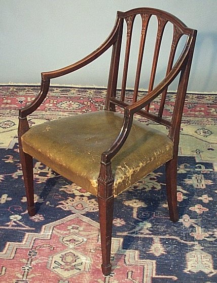 the arched top rail on vertical moulded supports, flanked by downswept arms, the stuff over seat on square tapering legs and spade feet