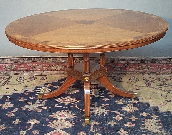 the quarter veneered top with boxwood stringing and inlaid central panel on four reeded columns and downswept feet with brass capped castors