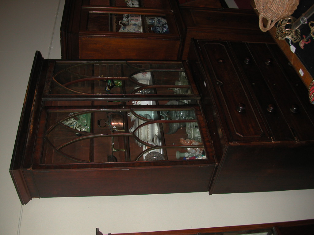 the associated top with moulded cornice above two arched glazed doors, enclosing adjustable shelves, the lower section with secretaire drawer, fitted with writing surface, various drawers and pigeon holes, above three long graduated drawers, on associated sabre feet