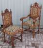 comprising a triple chair back canope, pair of fauteuils and six side chairs, each carved and turned with cabochon surmount, upholstered panel back and stuffover seat, on corresponding legs with H stretcher