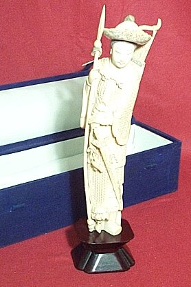 of a Japanese warrior armed with a spear, bow and a quiver of arrows with armorial crest and a sword, boxed