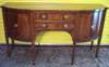 the rectangular top with bowed ends above two drawers flanked by bow front doors on square tapering legs and spade feet, with boxwood stringing throughout
