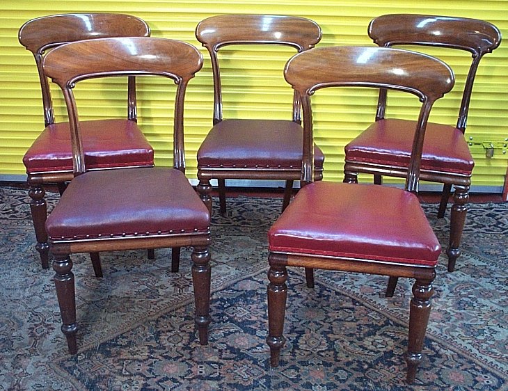 the rexine stuff over seat above a moulded frieze, on turned tapering front legs and pad feet (12)
