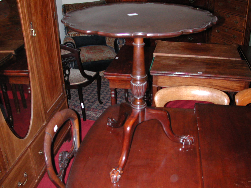 the circular top with pie crust edge and a turned tapering column and tripod base with hairy paw feet