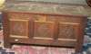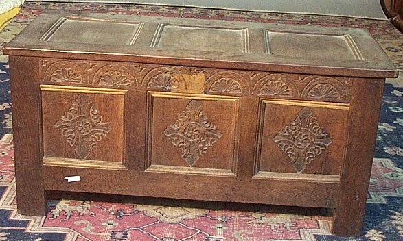 in the 17th century style, the oblong hinged top above a similar front with diamond shaped foliate carved panels, on stile supports