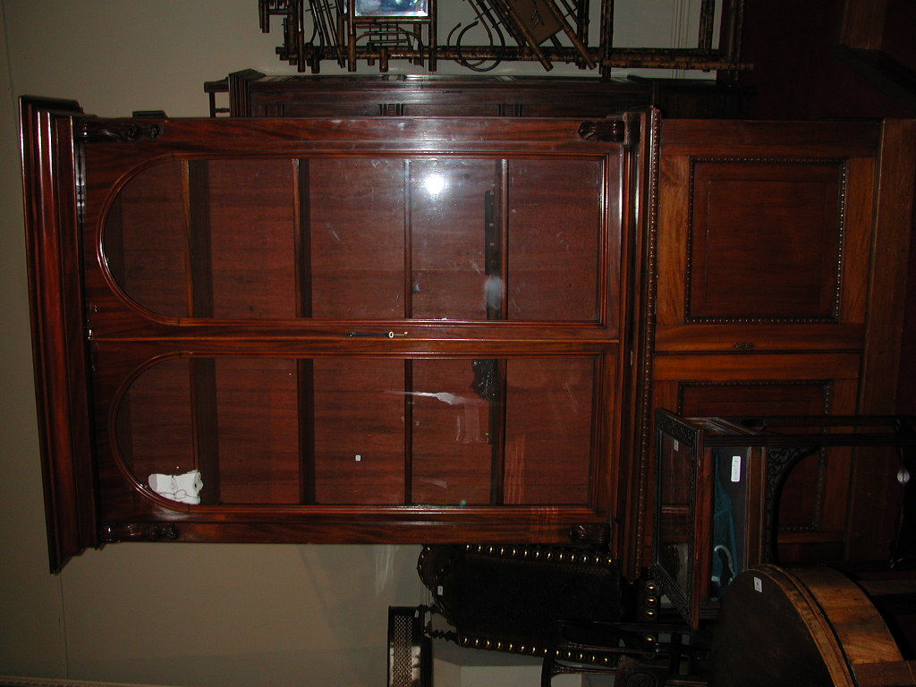 the moulded cornice above two glazed doors enclosing adjustable shelves, the base having two panelled doors with egg and dart moulding, on a plinth