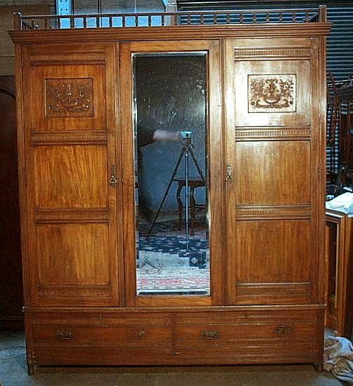 the spindle turned gallery above a moulded cornice, a mirror door below flanked by panelled doors, two lower drawers on turned feet