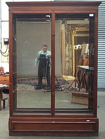 the moulded dentil cornice above glazed doors and similar sides, the interior with a mirror back, a drawer below, on a plinth