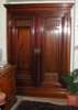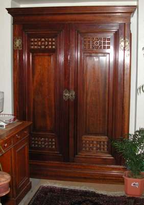the moulded cornice above plain frieze and pair of panelled doors with strapwork hinges enclosing interior with coat hooks and key shelf on stepped plinth base