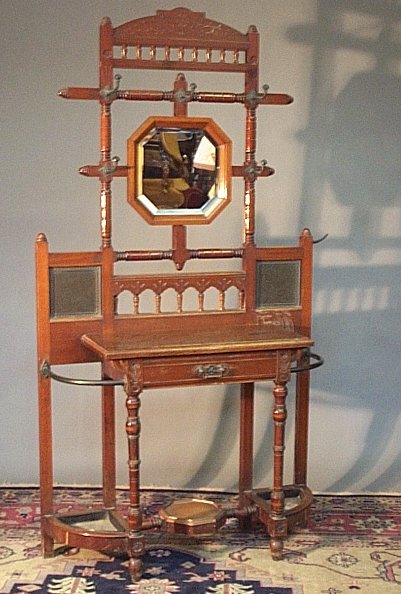 fitted with an octagonal mirror above a glove drawer, flanked by stick stands, on ring turned legs